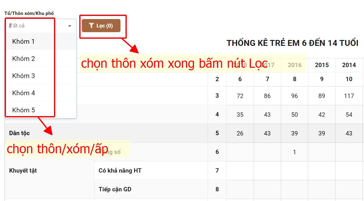 Mặc định sẽ xem số liệu toàn đơn vị, trường hợp muốn xem số liệu theo thôn/xóm/ấp thì Thầy/Cô có thể chọn rồi bấm nút Lọc