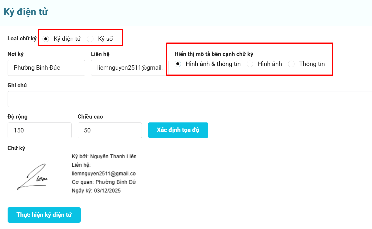 - Loại chữ ký (ký điện tử hoặc ký số)