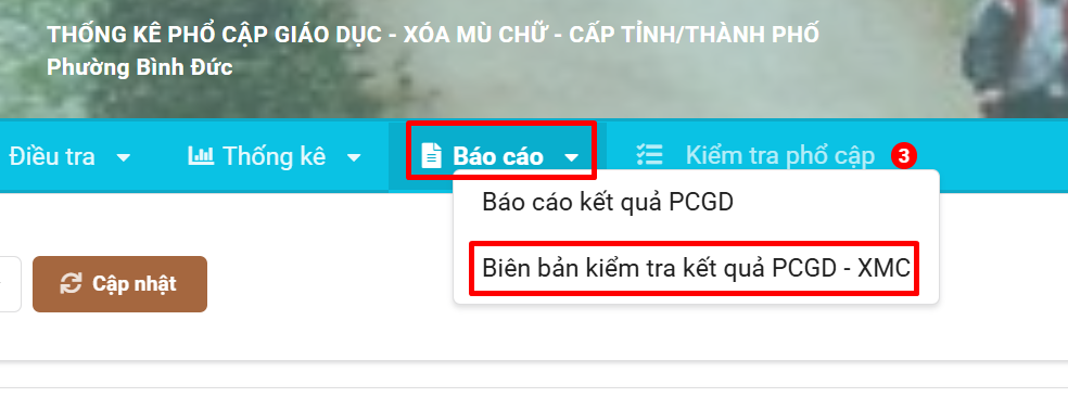 Bước 1: Vào menu Báo cáo -> Biên bản kiểm tra kết quả PCGD-XMC