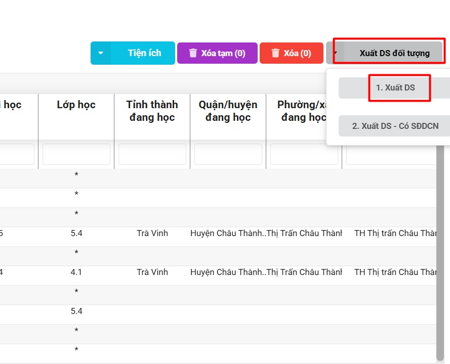 Sau khi lọc thông tin đối tượng, Thầy/Cô có thể xuất danh sách ra file excel để chỉnh sửa thông tin đối tượng trực tiếp ở file excel sau đó đưa vào phần mềm.