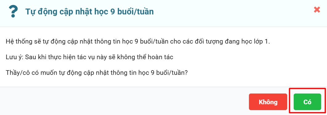 Mục đích: Dựa vào khối học là khối 1, trẻ 6 tuổi, phần mềm tự động check vào cột Học 9 buổi/tuần đồng thời bổ sung dấu * phía sau lớp học để tính vào thống kê mẫu 1.1