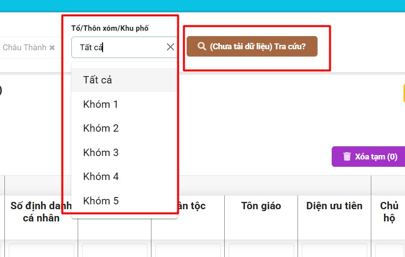 Bước 2: Chọn thôn/tổ/xóm hoặc chọn tất cả sau đó bấm nút (Chưa tải dữ liệu) Tra cứu? để xem danh sách đối tượng điều tra.