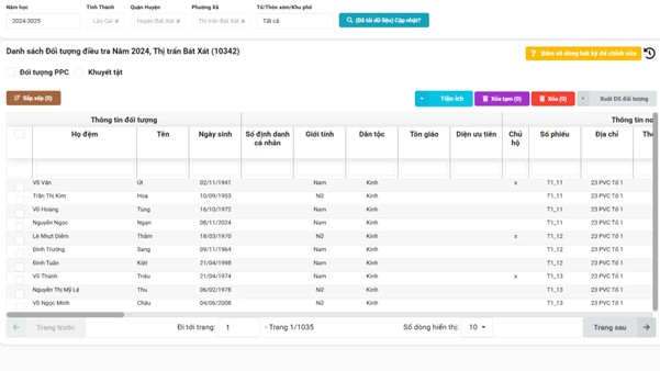 Lúc này phần mềm sẽ hiện danh sách đối tượng điều tra của Thôn xóm đã chọn như hình bên dưới.