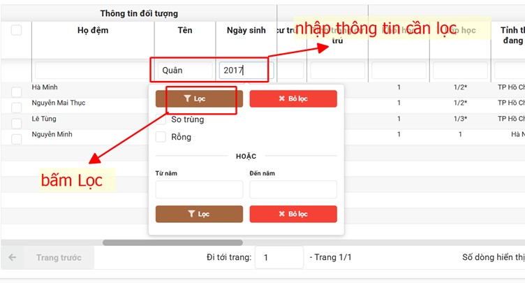 Nhập thông tin cần tìm vào dòng đầu tiên rồi bấm nút Lọc sẽ ra kết quả tìm kiếm. Ví dụ hình dưới tìm kiếm đối tượng tên Quân, sinh năm 2017. Kết quả tìm kiếm hiển thị được 4 đối tượng.