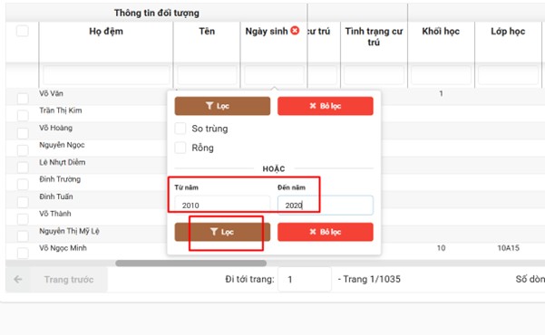 Ví dụ muốn lọc các đối tượng có năm sinh từ 2010 đến 2020 thì thao tác như hình dưới