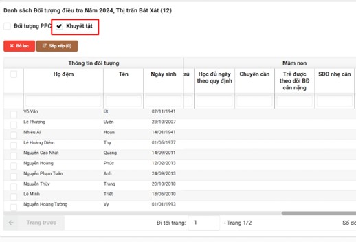 Muốn lọc những đối tượng là khuyết tật thì check vào ô Khuyết tật