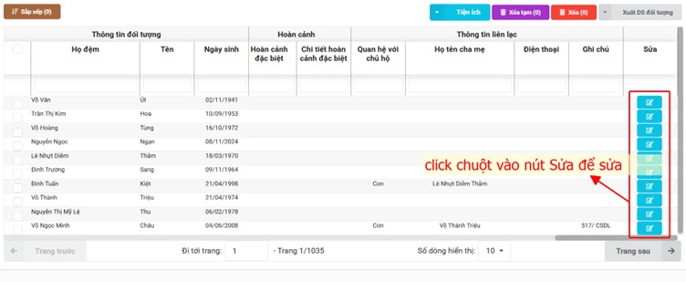 Có 2 cách để chỉnh sửa thông tin đối tượng. Chỉnh sửa trực tiếp hoặc bấm vào biểu tượng cây bút để chỉnh sửa:
