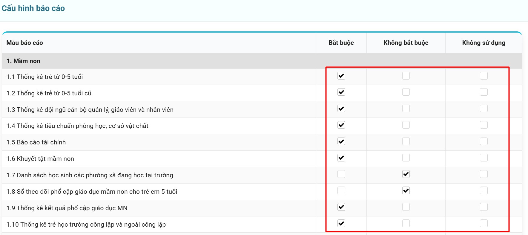 - Cột “Không bắt buộc”: Không cần gửi lên cấp trên. Những báo cáo loại này thường là danh sách, mặc định cấp trên sẽ thấy không cần phải gửi.