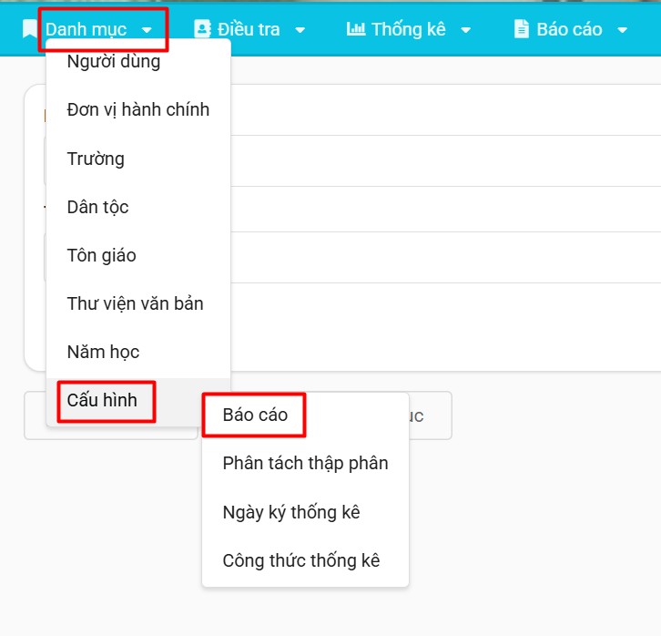 Bước 1: Bấm vào Danh mục -> Cấu hình -> Báo cáo
