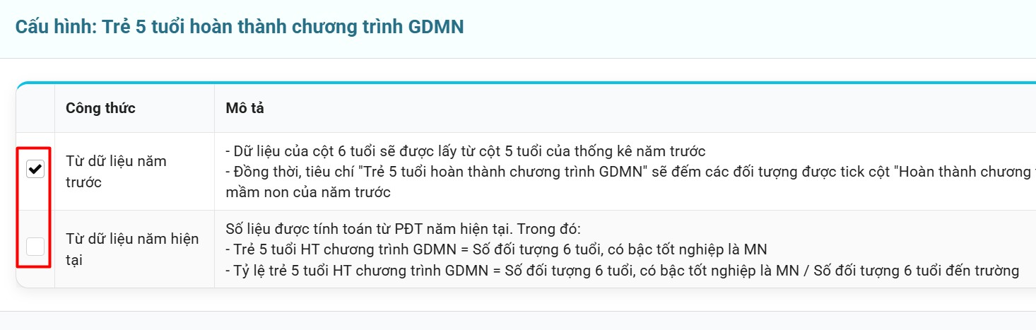 Mục đích: Tùy chỉnh công thức thống kê riêng cho từng mẫu theo nhu cầu của đơn vị. Tính năng này chỉ dành cho Sở, các cấp khác chỉ xem.