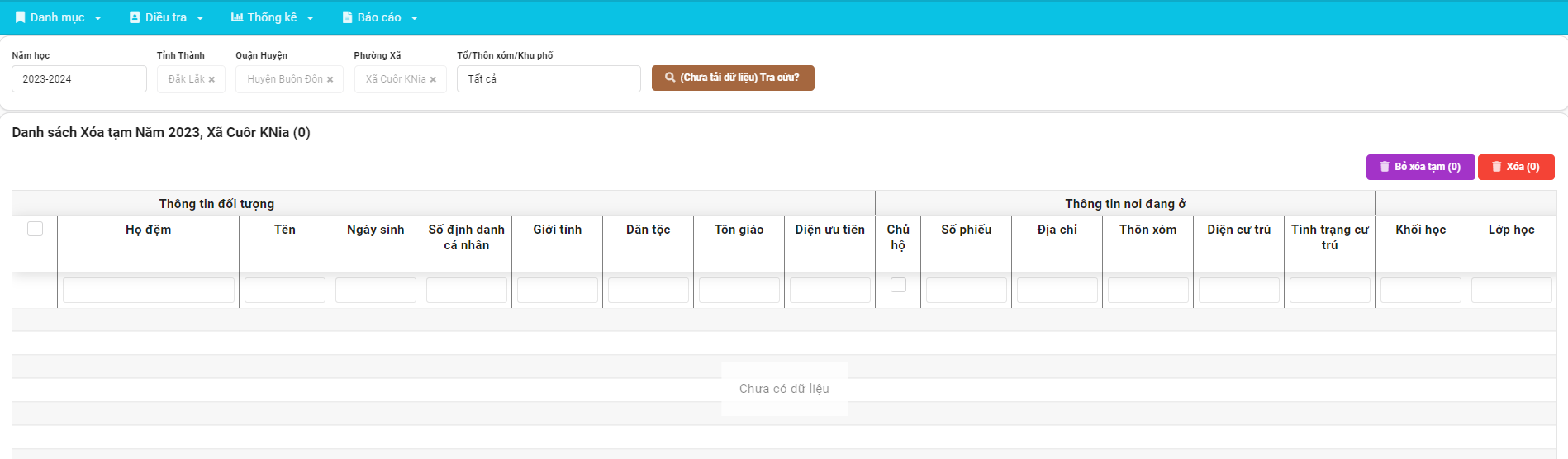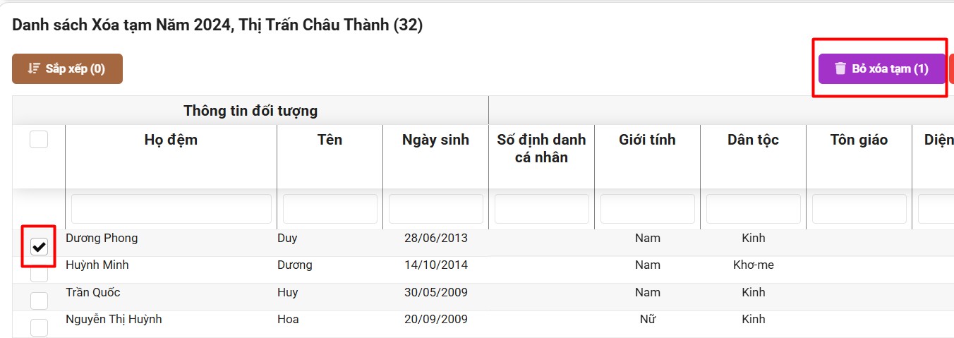 Bước 3: Nếu muốn khôi phục lại đối tượng xóa tạm thì Thầy/Cô bấm vào ô vuông trước cột “Họ đệm” sau đó bấm nút Bỏ xóa tạm . Đối tượng này sẽ trở về Danh sách phiếu điều tra và Danh sách đối tượng điều tra.