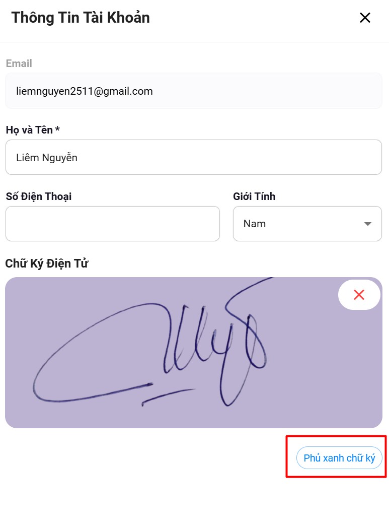 - Trường hợp nét chữ ký bị mờ thì có thể bấm nút Phủ xanh chữ ký để phần mềm xử lý đậm nét chữ ký