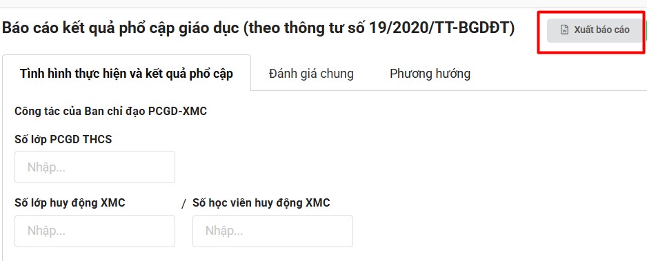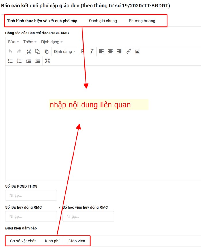 Thầy/Cô chỉ cần nhập các nội dung như ưu điểm, hạn chế, phương hướng phần mềm sẽ hỗ trợ tự động cập nhật số liệu ở các mẫu thống kê vào báo cáo kết quả PCGD theo thông tư 19/2020/TT-BGDĐT