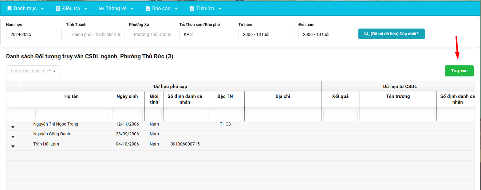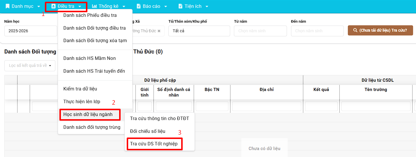Bước 1: Vào Điều tra > Học sinh dữ liệu ngành > Tra cứu DS Tốt nghiệp