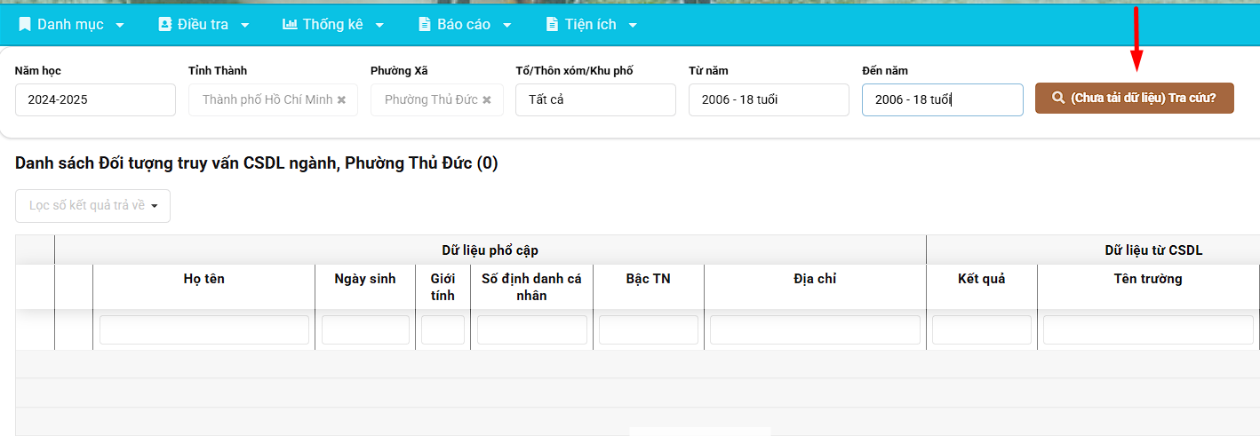 Tính năng dùng để tra cứu danh sách tốt nghiệp từ CSDL ngành để cập nhật cho đối tượng phổ cập. Tính năng này chỉ có thể sử dụng đối với đơn vị có kết nối đến CSDL ngành.