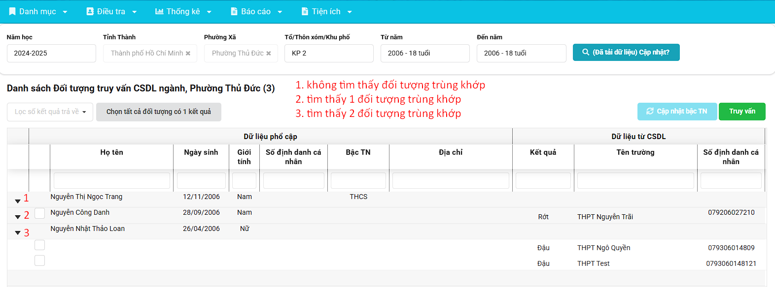 | 1. Không tìm thấy đối tượng trùng khớp | Kiểm tra lại thông tin đối tượng, bao gồm Họ tên, ngày sinh, giới tính, số định danh cá nhân (nếu có sử dụng) |