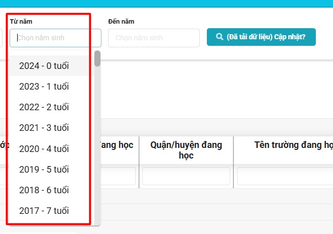 Bước 2: Chọn năm sinh từ năm đến năm để tra cứu (tối đa 5 độ tuổi). Trường hợp muốn lọc 1 độ tuổi thì chọn 2 năm sinh giống nhau.