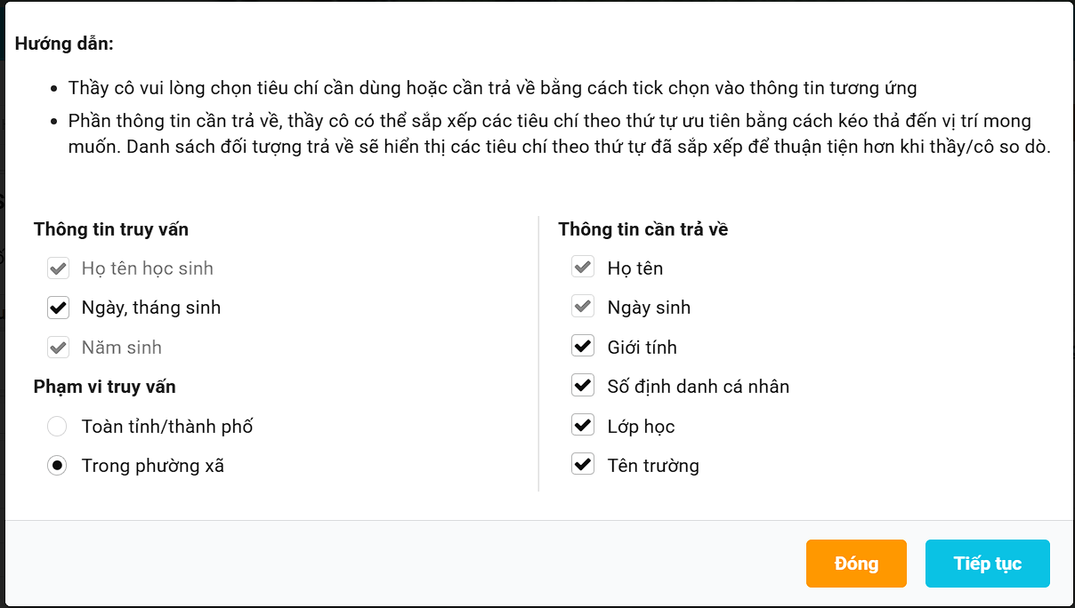 - Phạm vi truy vấn: Mặc định truy vấn những đối tượng thuộc phường/xã của thầy cô trong CSDL ngành.